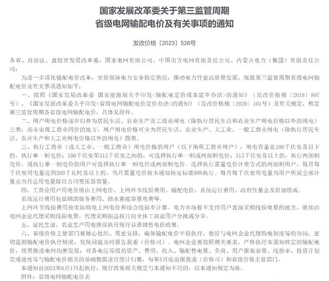 5月15日,國家發改委官網發布《關于第三監管周期省級電網輸配電價及有關事項的通知》(發改價格〔2023〕526號)、《關于第三監管周期區域電網輸電價格及有關事項的通知》(發改價格〔2023〕532號)關于輸配電價的重要文件。本次文件在2015年電力市場化改革后可以視為里程碑式的文件。