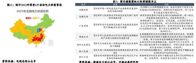 2023年國內電力供需關系預計仍將緊張。在全國經濟平穩復蘇的大背景下,全社會用電量有望持續增長,國內電力供需關系預計將呈現 相對緊張的狀態。在迎冬度夏的用電高峰期,國內部分地區缺電問題預計會地方企業的生產生活造成不利影響。根據電規總院預測, 2023年全國將有6個省份電力供需形勢緊張,17個省份電力供需偏緊。