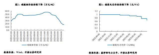 碳酸鋰降價大背景下,儲能電站經濟性改善有望推動電站裝機持續放量。受電動汽車需求萎縮影響,碳酸鋰價格由2022年末 高點的57萬元/噸持續下跌,到2023年4月碳酸鋰價格最低已跌至17.65萬元/噸,相比最高點價格下滑68.9%。碳酸鋰價格下同 樣帶動儲能電芯售價持續下降。截至2023年4月28日,儲能電芯均價已跌至0.66元/Wh,相比此前的價格高點已經降低了33.7%。 儲能電芯作為鋰電儲能系統當中的主要零部件成分,其價格走低有望進一步降低鋰電儲能系統成本提升儲能電站運營的經濟 性,刺激終端業主的裝機需求。成本下行大背景下,全球儲能裝機有望持續走高。