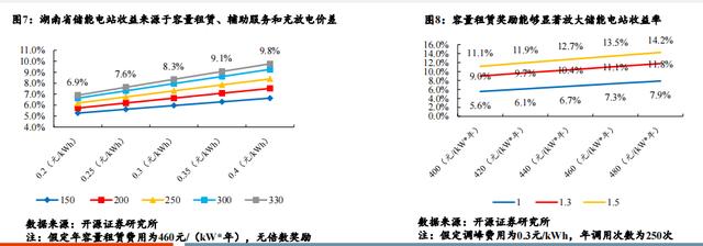 并且在容量租賃獎勵為1.3倍和1.5倍時,其資本金收益率能夠放大至11.1%與13.5%??紤]到當前湖南省仍存在較大的電 網側儲能裝機缺口,調峰服務輔助頻次和價格均有望實現較大的提升,在不考慮容量租賃獎勵的情況下,其資本金收益在年調用次 數為330次,調峰輔助服務收益為0.4元/kWh的情況下,其資本金收益率能夠達到9.8%。隨著電力輔助服務種類增多和電力現貨市場 的開展,其收益方式有望進一步增加。同時儲能電站的收益在一定程度上依賴電站運營商自身的運營水平,隨著儲能電站運營商的 經驗積累,收益能力有望進一步提升。