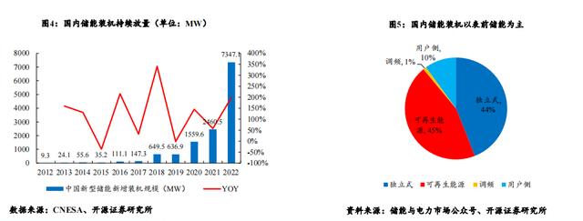 國內儲能裝機有望持續增長,表前儲能為裝機主力。根據CNESA數據統計,2012-2022年間國內新型儲能新增裝機復合增 速高達95%。2022年國內新型儲能新增裝機高達7.3GW,同比增長近200%。就國內儲能裝機類型分布而言,根據儲能與 電力市場公眾號統計,可再生能源配儲與獨立儲能裝機占比分別為45%與44%,用于調頻的裝機占比僅為1%,工商業用 戶側儲能裝機占比10%。我國當前的儲能類型主要還是以用于配套新能源裝機的表前儲能裝機為主。
