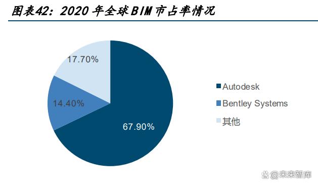 信創發展背景下,BIM 行業國產化替代需求強烈。信息技術應用創新為近年以來我國關鍵 命題,旨在通過對 IT 硬件、軟件的重構,建立我國自主可控的 IT 產業標準和生態,逐步 實現各環節國產替代。國內使用的 BIM 平臺主要為國外軟件,而國內廠商主要以項目管理 和單點應用類型的產品為主,底層核心技術大多掌握在國外廠商手中。2020 年全球 BIM 行業市場中,Autodesk 市占率為 67.9%,其次 Bentley Systems 市占率為 14.37%,CR2 集中度較高,顯示出國產替代的必要性和緊迫性。