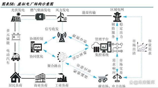 虛擬電廠本質上是一套軟件平臺系統,核心為“通信”和“聚合”。通過先進信息通信技 術和軟件系統,實現分布式電源、儲能系統、可控負荷、電動汽車等分布式能源資源的聚 合和協調優化,以作為一個特殊電廠參與電力市場和電網運行的電源協調管理系統,為配 電網和輸電網提供管理和輔助服務。虛擬電廠概念的核心可以總結為“通信”和“聚合”, 關鍵技術主要包括協調控制技術、智能計量技術以及信息通信技術。 虛擬電廠分為兩類:“負荷類”虛擬電廠,和“源網荷儲一體化”虛擬電廠。1)“負荷類” : 聚合了具備調節能力的電動汽車、充電樁等市場化用戶,作為一個整體,對外提供負荷側 靈活性相應調節服務。2)“源網荷儲一體化”:聚合新能源發電、用戶及配儲一系列環節, 作為獨立市場主體參與電力市場、具備自主調峰調節能力。 具備“源-荷”雙重身份,有效實現削峰填谷。虛擬電廠把各類可調負荷資源匯聚,根據 電網削峰填谷的需求,進行線上填報,計劃下發,執行反饋,類似于線上工單派單系統。 電網給調度指令計劃,需求響應調控計劃,提前幾天/幾周把計劃發下來。負荷集成商, 虛擬電廠運營商,會把計劃告訴客戶,哪些時段把負荷停掉,把用電負荷降下來,具有源 -荷雙重身份。
