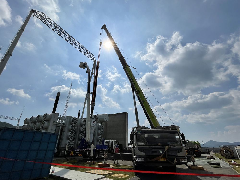 值得一提的是,高中壓套管拉桿更換是此次大修工作的重點,高達14.2米的套管需要兩輛吊車配合吊裝,吊裝工作尤為重要。“變壓器本體排油完成,可以開始吊裝工作!”現場工作人員使用套管安裝專用吊具小心翼翼地將拉桿式結構套管垂直起吊,并在吊裝區的四個方向均設置專人監護,隨時注意吊裝情況。套管落地后,工作人員隨即有序開展瓷瓶探傷、拉桿和紫銅底座的檢查和更換各項工作,現場有條不紊,各方人員團結一致,力爭縮短變壓器器身暴露空氣時間,嚴格按照相關工藝要求進行檢查、記錄數據,最后成功在計劃時間內完成套管復裝。