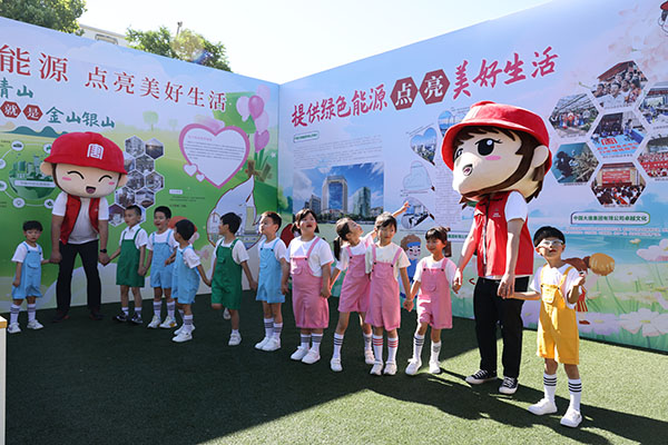在展示區,大唐環境設置了企業形象展臺,邀請華奧學校全體師生和學生家長參觀以“綠水青山就是金山銀山”為主題的科普展板。