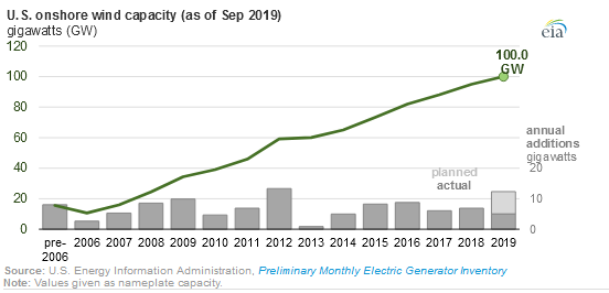 根據美國能源信息管理局(EIA)數據,截至2019年9月,美國的陸上風電累計裝機容量已超過100 GW,到2020年底可能達到122 GW。