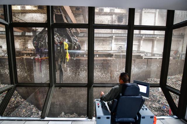 9月19日,在山東啟迪濟能環保科技有限公司,工作人員在控制室內操作設備吊運垃圾。