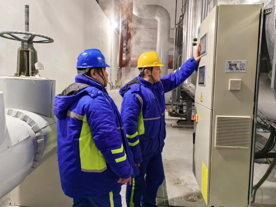 中國節(jié)能所屬中國環(huán)保行唐公司運(yùn)行人員檢查供熱首站運(yùn)行狀態(tài)
