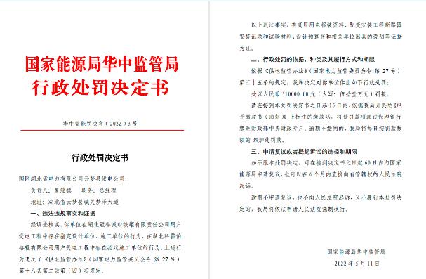 文號“行政處罰決定書[2022]3號”行政處罰決定書顯示,國網湖北省電力有限公司云夢縣供電公司在湖北冠譽誠印鐵罐有限責任公司用戶受電工程中存在指定設計單位、施工單位的行為,在湖北科雷伯格輥有限公司用戶受電工程中存在指定施工單位的行為。上述行為違反了《供電監管辦法》(國家電力監管委員會令 第 27 號) 第十八條第二款第(四)項規定。