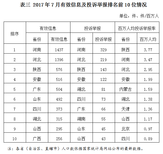 各省(自治區(qū)、直轄市)按照收到的有效信息數(shù)量排序,河南、河北、陜西、安徽、廣東等省列全國前10位;按照投訴舉報數(shù)量排序,河南、河北、陜西、安徽、湖北等省排在全國前10位。按照百萬人均投訴舉報率排序,陜西、河南、河北、安徽、內(nèi)蒙古等省位于全國前10位。(2017年7月有效信息及投訴舉報排名前10位情況見表三)