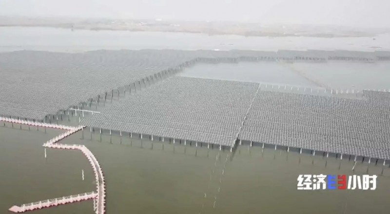 宿遷市泗洪縣天崗湖面上有一片一眼望不到頭的光伏電站,光伏板下的湖面就是天崗湖鄉(xiāng)村民們養(yǎng)魚的地方。
