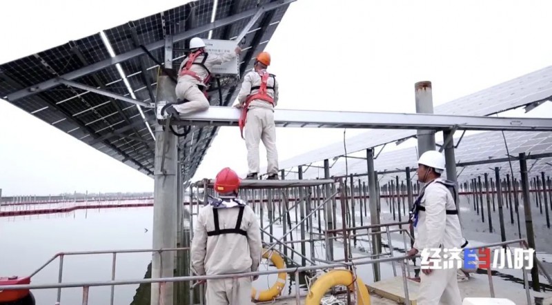 這個漁光一體光伏電站,光伏板能遮擋陽光,降低水面溫度,減少水分蒸發(fā)的同時抑制藻類生長,為魚蝦提供更好的生長環(huán)境。