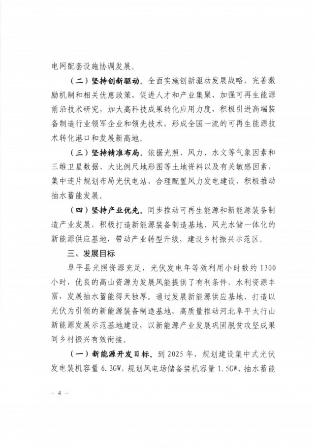 三、原則同意《河北阜平太行山新能源發(fā)展示范基地實(shí)施方案》提出的新能源開(kāi)發(fā)目標(biāo),到2025年規(guī)劃建設(shè)集中式光伏6.3GW、風(fēng)電1.5GW、抽水蓄能1.2GW,2030年在此基礎(chǔ)上進(jìn)一步實(shí)現(xiàn)高質(zhì)量跨越式發(fā)展。