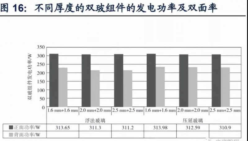 超白浮法玻璃力學性能更優,薄化后作為背板的發電功率接近超白壓延玻璃,陸續出現組件廠商采用超白浮法玻璃作為背板以降低成本。浮法玻璃表面平整度高,抗沖擊強度較壓延玻璃更為出色,并且隨著厚度降低,二者抗沖擊強度相差拉大,在1.6 mm浮法玻璃平均破碎高度高出超白壓延玻璃達97.77%。另外,雖然浮法玻璃透過率不如超白壓延玻璃,作為雙玻組件背板后會導致背面發電功率降低,但隨著厚度減小,二者發電功率差距逐漸降低,1.6mm雙玻組件下的背面發電功率相差僅為5.45W。浮法玻璃作為組件背板使用時,雙玻組件正面發電功率也可達到壓延玻璃作為背板時的發電功率。因此陸續有組件公司為降低生產成本,使用浮法玻璃作為背板。