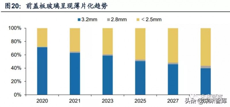超薄光伏玻璃減少原片使用,助力降本同時順應雙面組件輕量化需求,有望成為雙玻組件主流產品。超薄光伏玻璃節省原片使用量,價格相對傳統光伏玻璃更低,市場份額將伴隨雙玻組件滲透逐年提升。根據CPIA統計,2020年2.5mm及以下厚度的前蓋板玻璃市占率約為29%,2025/2030年有望提升至47%/56%。