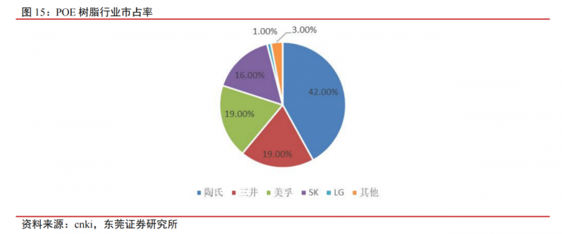 目前,陶氏化學以42%的市場份額,成為全球排名第一的POE樹脂龍頭公司,三井化學、美孚公司均以19%的份額分列二三位。