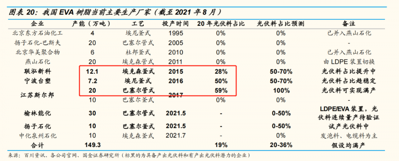 縱觀所有具備EVA產能的國內企業,能夠生產光伏級EVA的也只有斯爾邦、聯泓新科和寧波臺塑三家。榆林能化、揚子石化、中化泉州石化均在2021年5-7月投產EVA材料,但暫未具備生產光伏級EVA的能力。