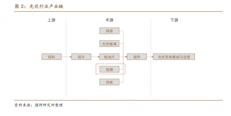一套交付給電站的完整光伏組件包括:焊帶、光伏玻璃、電池片、膠膜、背板五部分。其中,電池片和光伏玻璃是成本占比較高的部分,膠膜的市場份額要小很多。