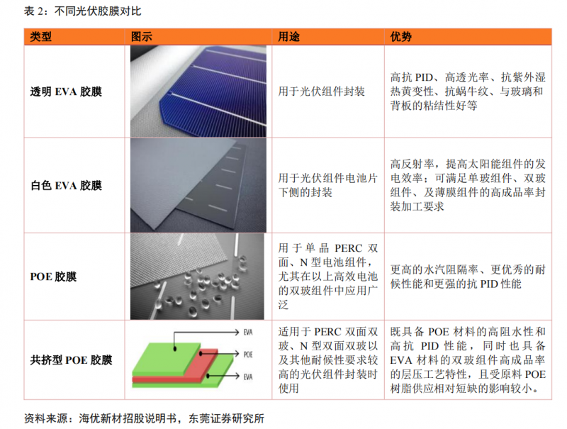 為了解決PID現象,POE膠膜應運而生,目前滲透率正在逐漸提升。與EVA膠膜相比,POE膠膜具有更高的水汽阻隔率、更優秀的耐候性能和更強的抗 PID性能,能夠有效的提升組件的使用時長。