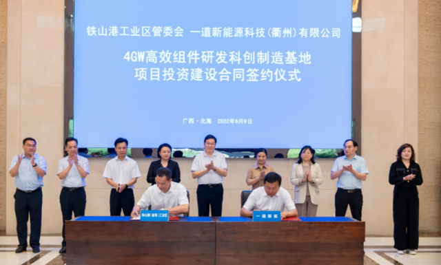 6月9日,一道新能簽約北海市投資建設的10GW高效組件研發科創制造基地項目,其中一期4GW高效組件研發科創制造基地項目將建設6條光伏組件生產線。