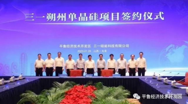 簽約儀式上,朔州市平魯區委書記郝云,三一集團副總經理、硅能事業部常務副總經理張淳,分別代表地企雙方簽訂單晶硅項目合作協議。朔州市與三一集團有關領導共同見證簽約。