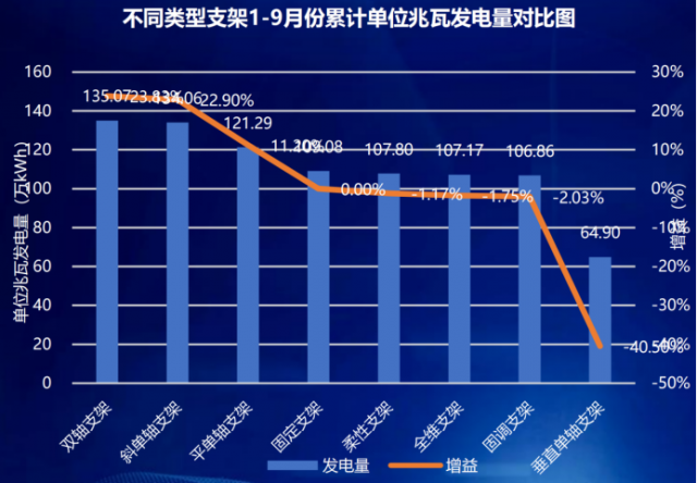 從支架實證數據分析,前三季度整體來看雙軸跟蹤系統發電量最高,斜單軸和平單軸次之,分別較固定支架發電量增益依次為23.83%、22.89%和11.2%;全維支架第一季度和第二季度由于支架跟蹤故障,正面輻照較低,7月份開始正常運行后發電量明顯提高,第三季度發電量最高;另外,柔性支架總體發電量略低于固定支架,兩種柔性支架之間發電量一致性相對較差,累計發電量差1.8%。同時,從實證出力曲線來看,跟蹤支架與固定支架、柔性支架相比功率曲線更加偏平,對電力系統更加友好。