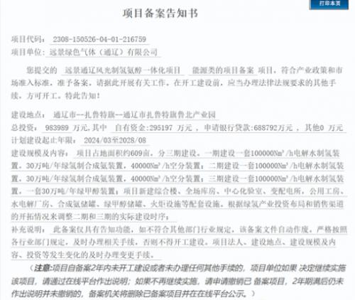 據悉,該項目位于通遼市扎魯特旗通遼市扎魯特旗魯北產業園,由遠景綠色氣體(通遼)有限公司實施,項目總投資98.4億元,計劃建設起止年限:2024/03至2028/08。