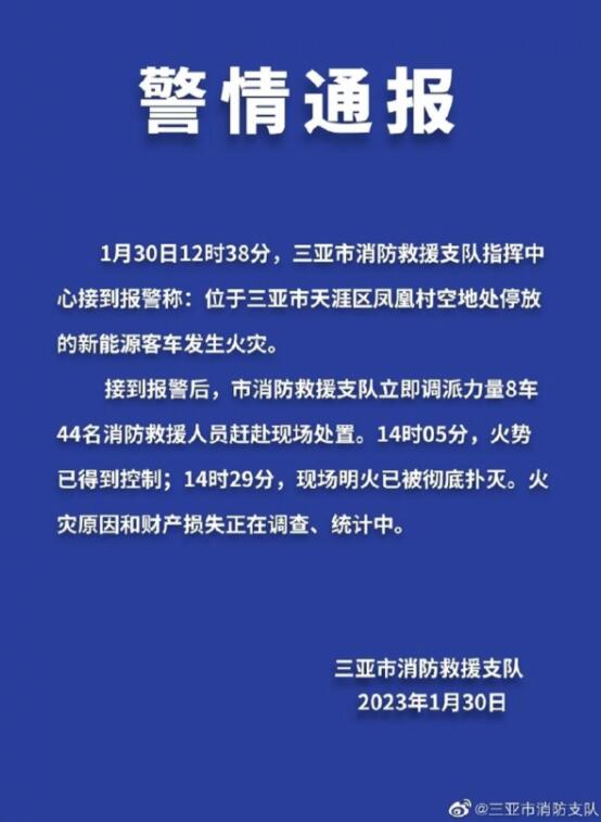 另據三亞市消防支隊通報稱,30日12時38分,三亞市消防救援支隊指揮中心接到報警稱:位于三亞市天涯區鳳凰村空地處停放的新能源客車發生火災。支隊調派8車44名消防救援人員趕赴現場處置。14時05分,火勢已得到控制;14時29分,現場明火已被徹底撲滅?;馂脑蚝拓敭a損失正在調查、統計中。