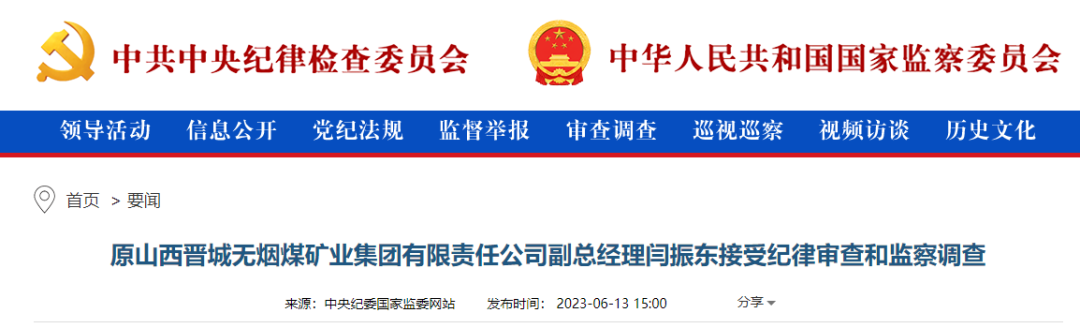 中央紀委國家監委網站6月13日消息,據山西省紀委監委消息:原山西晉城無煙煤礦業集團有限責任公司副總經理閆振東涉嫌嚴重違紀違法,目前正接受山西省紀委監委紀律審查和監察調查。