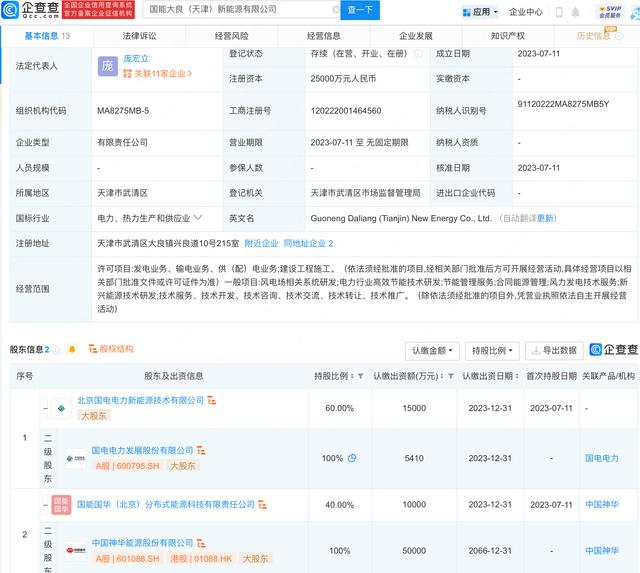 企查查APP顯示,近日,國能大良(天津)新能源有限公司成立,法定代表人為龐宏立,注冊資本2.5億元人民幣,經營范圍包含:風電場相關系統研發;電力行業高效節能技術研發;節能管理服務;合同能源管理等。企查查股權穿透顯示,該公司由國電電力(600795)、中國神華(601088)間接共同持股。