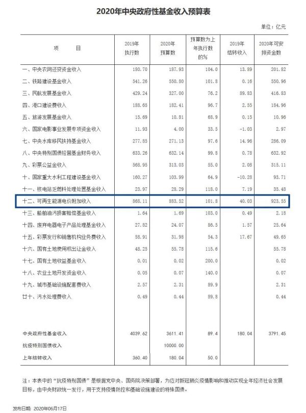 《2020年中央政府性基金支出預算表》顯示,2020年可再生能源電價附加支出預算數(shù)為923.55億元,比2019年執(zhí)行數(shù)增加64.37億元,增長7.5%。其中,中央本級支出預算數(shù)為838.65億元,比2019年執(zhí)行數(shù)增加60.55億元,增長7.8%。中央對地方轉移支付預算數(shù)為84.9億元,比2019年執(zhí)行數(shù)增加3.82億元,增長4.7%。按規(guī)定標準,對利用可再生能源發(fā)電的企業(yè)和個人進行補貼,支持可再生能源產(chǎn)業(yè)發(fā)展。