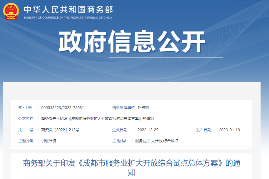 1月10日,商務部發布《成都市服務業擴大開放綜合試點總體方案》(以下簡稱《方案》)。