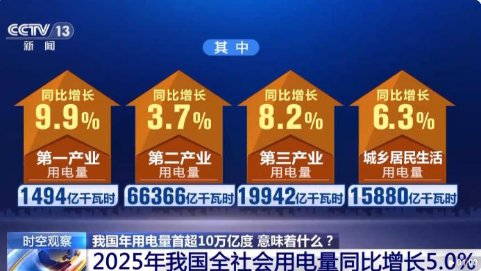 撐起10萬億度電供給超10萬億度的年用電量,也考驗著一個國家電力系統的供給能力與韌性。2025年,我國通過構建清潔低碳的發電體系、打造高效互聯的輸電網絡、完善靈活智能的調度機制,實現了電力的穩定可靠供給。10萬億度電究竟用在了哪里?