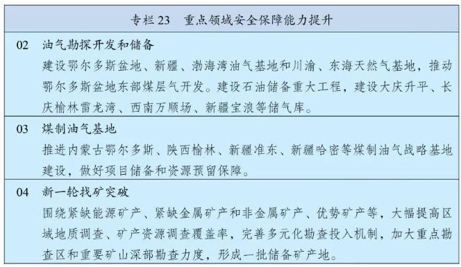 《綱要》提出,要強化能源資源供應保障,要堅持立足國內、補齊短板、多元保障、強化儲備,加強能源產供儲銷體系建設。堅持油氣核心需求自主保障,實施中長期油氣增儲上產戰略行動,確保原油年產量穩定在2億噸左右、天然氣產量穩步增長,加強煤制油氣產能和技術儲備。強化政府儲備和企業儲備協同,提升國家石油儲備規模,建立更加靈活的輪換動用機制,增強天然氣儲備調節保障能力,完善煤炭儲備體系。健全能源保供中長期合同制度,完善電力應急調度機制和備用電源配置,強化能源需求側管理。加強戰略性礦產資源勘探開發和儲備,深入實施新一輪找礦突破戰略行動,統籌加強產品、產能和產地儲備,推動大宗商品儲運基地建設,提升戰略性礦產資源安全風險監測預警和應急保供水平。加強能源資源開發國際合作,維護戰略通道安全。