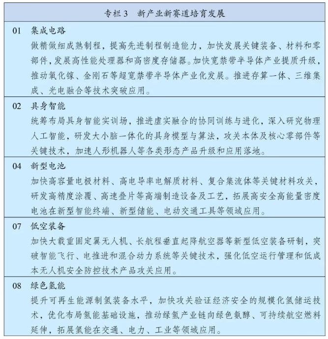 《綱要》提出,要前瞻布局未來產業,瞄準引領未來發展重點領域,構建未來產業全鏈條培育體系,推動量子科技、生物制造、氫能和核聚變能、腦機接口、具身智能、第六代移動通信等成為新的經濟增長點。加強未來產業識別和動態調整,強化基礎性、前沿性、顛覆性技術布局。