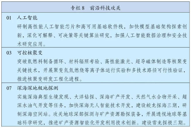 《綱要》提出,要強化戰略前沿領域科技布局,瞄準世界科技前沿強化系統布局,實施人工智能、量子科技、生物科技、新能源等科技戰略部署,加快突破基礎理論和底層技術,促進轉化應用。高水平組織前沿技術預測預見,建立國家關鍵和新興技術清單,持續推動前沿技術研發。強化科學研究、技術開發原始創新導向,優化有利于原創性顛覆性創新的環境,創新非共識項目遴選和資助機制,擴大國家重大科技任務、國家自然科學基金原創性顛覆性項目規模和比例。突出國家戰略需求,扎實推進國家科技重大專項,超前部署面向2035的國家重大科技項目。