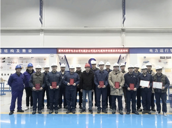 其中,2023年組織國網客戶(包括國網天津市電力公司電纜分公司、國網石家莊供電公司、國網濟南供電公司、國網南昌供電公司、國網保定供電公司、國網鄭州供電公司電纜運檢中心、國網長沙供電公司電纜檢修公司、國網四川省電力公司成都供電公司等)來司開展高壓電纜附件安裝培訓共計9場,參訓學員48人,累計培訓學時584小時;受國網客戶單位邀請開展各類技能比武、安裝技能提升培訓指導服務共計12次,累計培訓、指導課時418小時。2024年2月底到3月初,為國網天津市電力公司電纜分公司的15名青年職工提供為期5天的專業培訓。