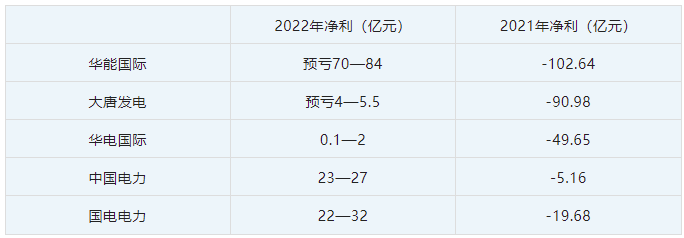 華電國際預計2022年實現歸母凈利潤0.1億元至2億元,較上年同期(重述后)減虧49.92億元到51.82億元。國電電力發布業績預告,預計2022年全年盈利22億元至32億元,同比上年增加218.55%至272.43%。