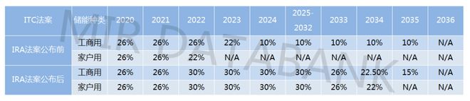 美國IRA法案出臺,獨立儲能納入ITC補貼范圍,并將ITC補貼有效期將持續到2033年,并將抵免劃分為基礎抵免+額外抵免。其中基礎抵免額度由之前的26%上升至30%,此前為逐年退坡。具體變化情況如下表: